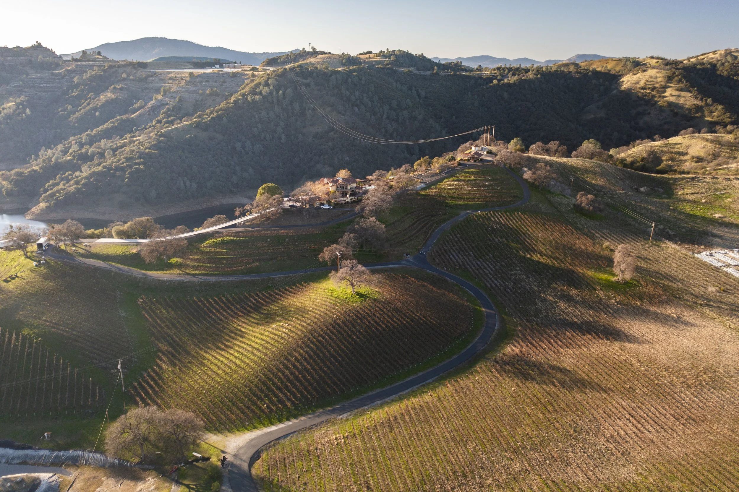 Perched on a hilltop above New Melones Reservoir, Airola Road Vineyards spans 61 acres of estate-grown vines in the heart of the Sierra Foothills. Since 2001, we have tended this land with care, stewards of a place where morning fog rises from the water, summer winds sweep across the ridge, and the ancient rhythms of Gold Country shape every vintage.
